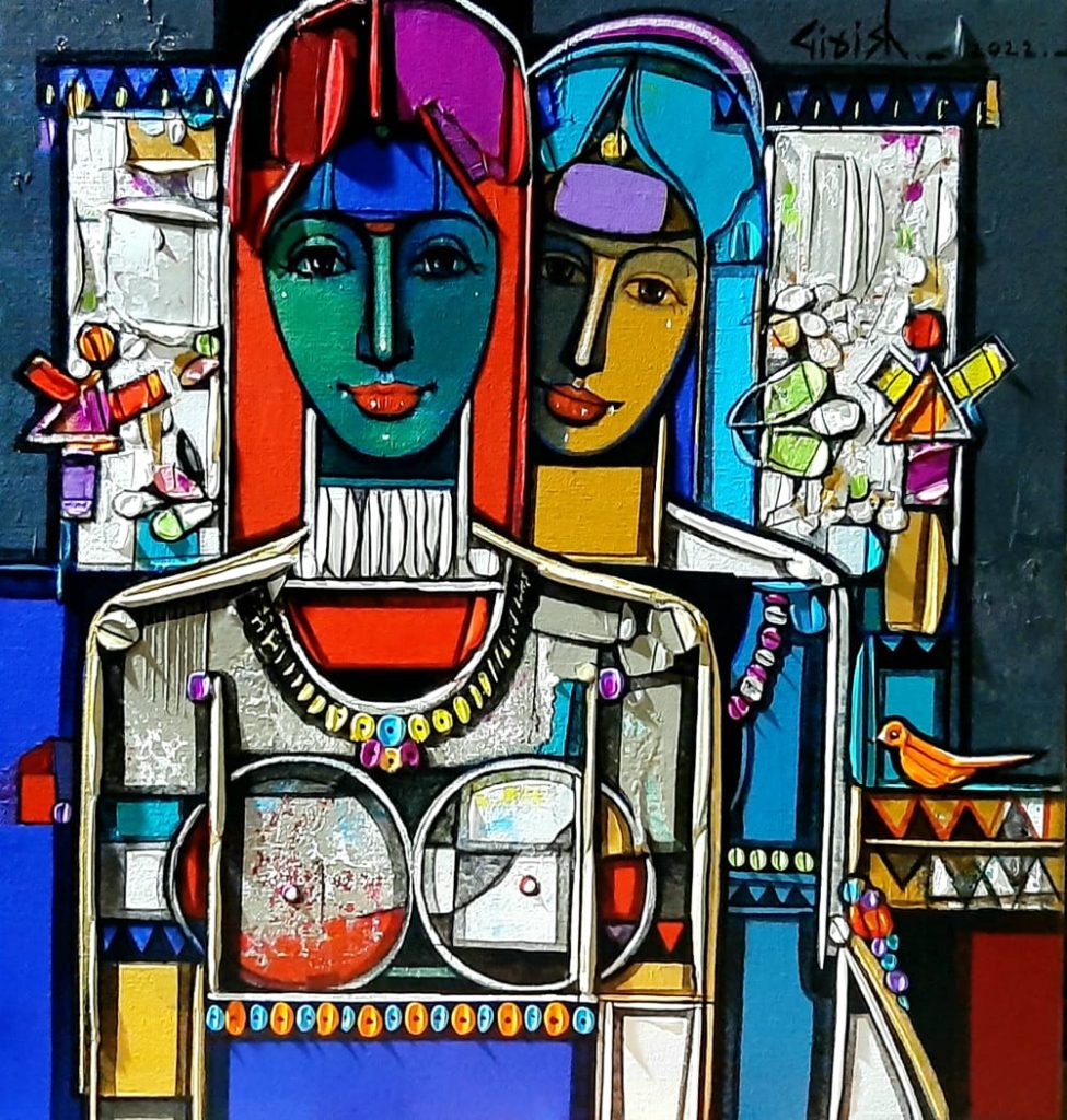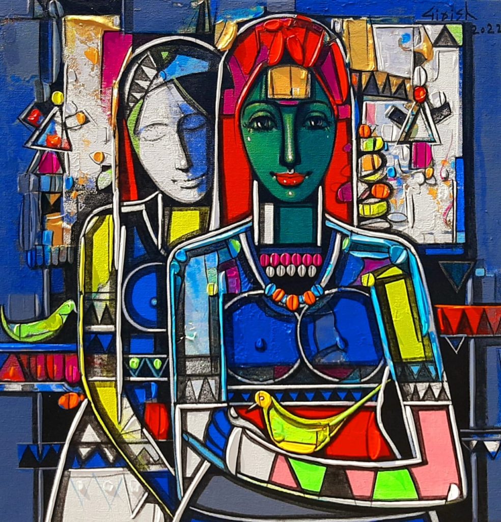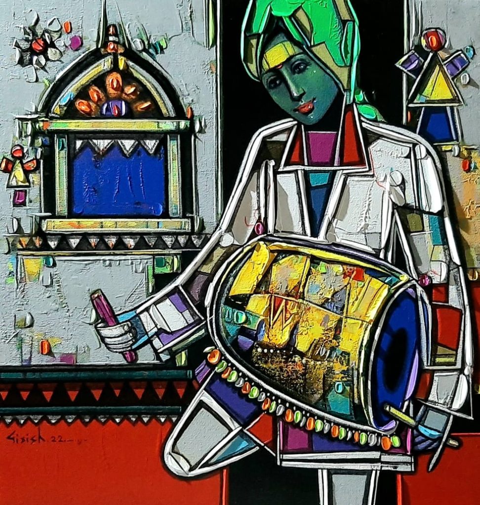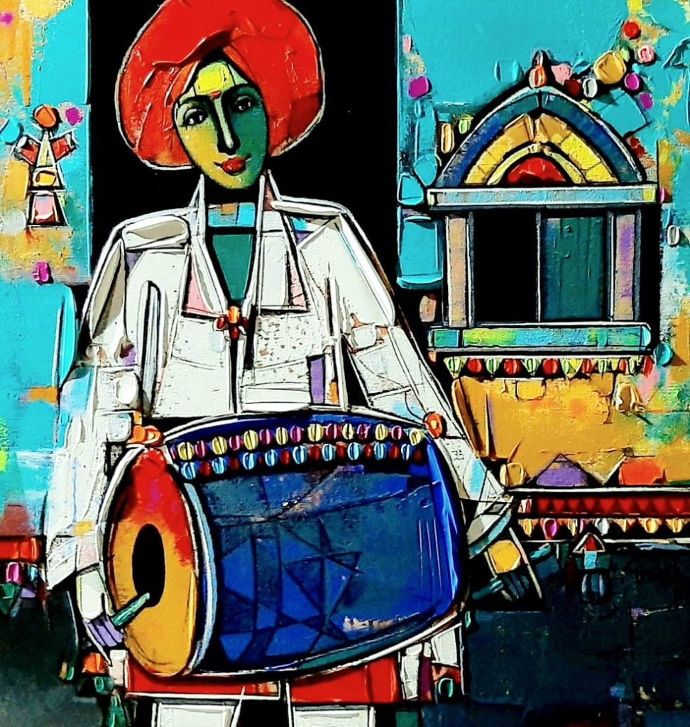 Girish works both in oil & acrylic and uses vibrant palette in depicting the human figures. Most of his theme is based on rural culture, young people whether male or female in traditional attire and busy in their day to day life. His style of doing art is what attracts every single person who gets to witness his art’s mystique beauty. The textures, vibrant colours, theme, never fails to grab your eyeballs. The three dimensional effect the artwork gives to the onlookers due to the paintings style is also very unique and has the capability to hold your attention for countless minutes to it.